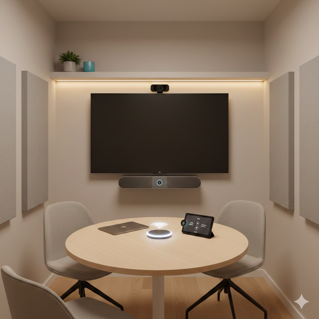 In a large boardroom, you might see discrete components: microphones in the ceiling, speakers in the walls, and a camera mounted separately. For a huddle room, this approach is often overkill—both for your budget and the physical space.